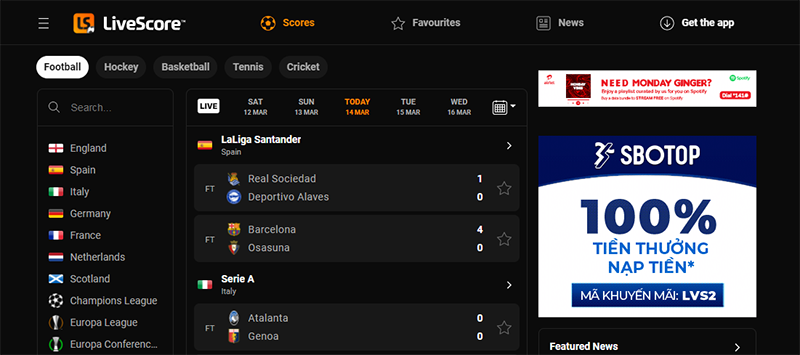 Đầu tiên, anh em hãy truy cập vào địa chỉ livescore.com nhé. Chờ vài giây kết nối, bạn sẽ thấy được toàn bộ giao diện của trang website này.