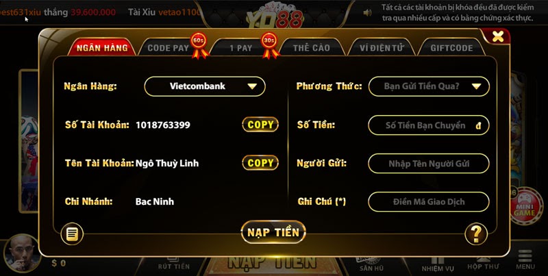 Cách nạp tiền vào game bài Yo88